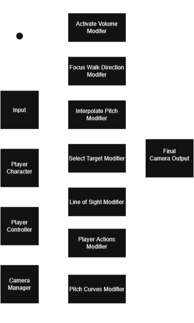 One of my goals for the camera was to reduce unneeded player input. After all, player's should be focused on playing the game and not wrestling with the camera controls. One of the main ways I do that is through the Focus Walk Direction Modifier. It gets the direction the player is moving in and rotates the yaw to match that direction. This keeps the focus on where the player is moving towards so that they can freely move in any direction without thinking about the camera controls.